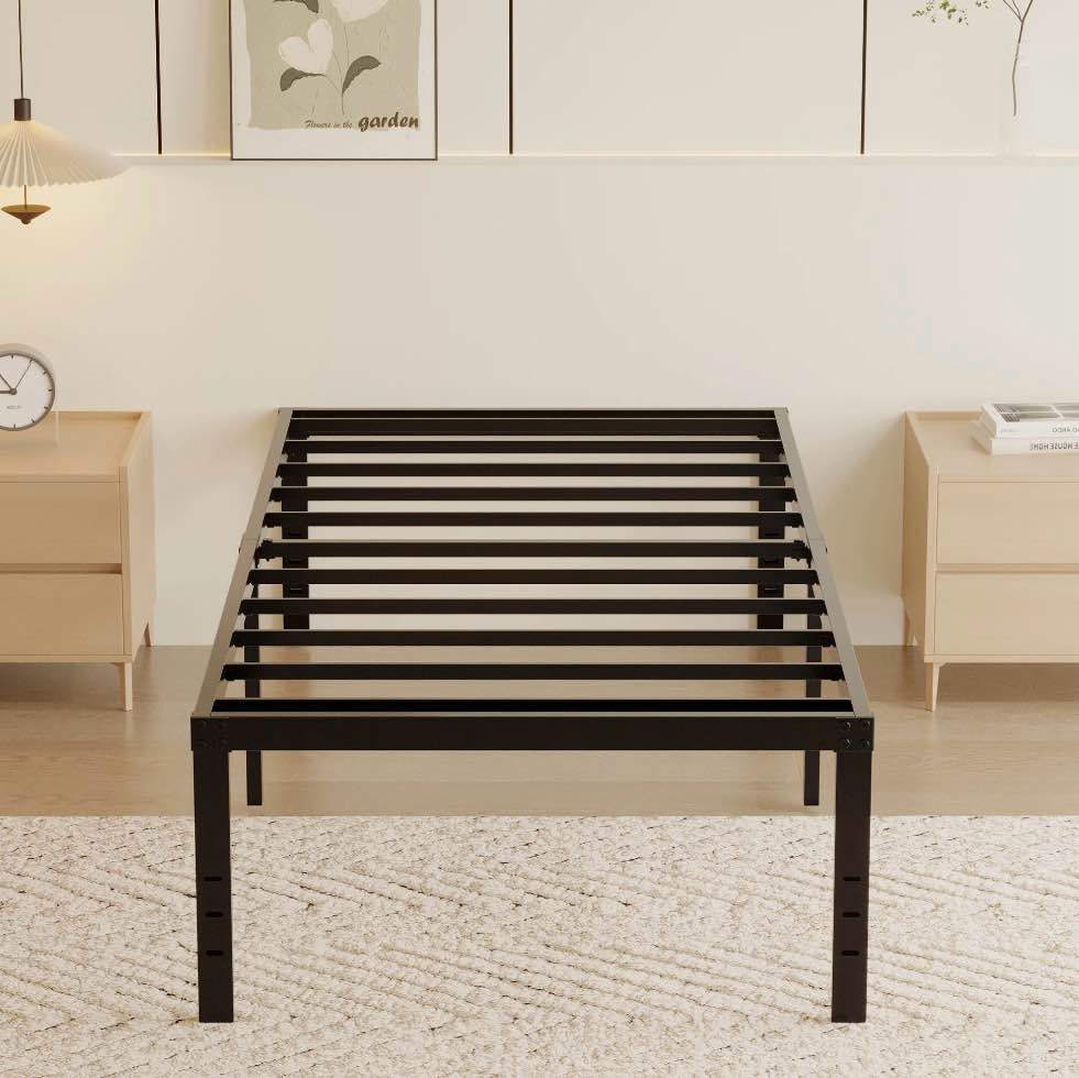 chuangshuo guard full size bed frame with led storage headboard shelf, noise-free, metal platform bed, black